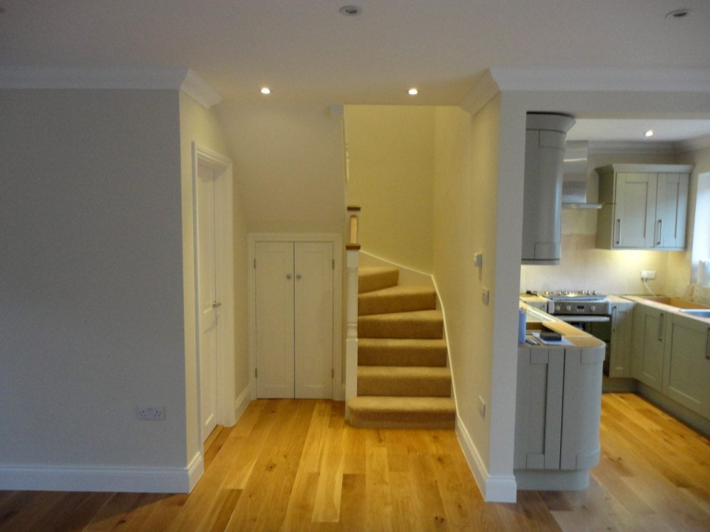 Again a rather boring 1970’s semi. The stairs were replaced and turned to make better use of the space. This enabled a door to a ground floor cloak room together with a larger landing. The small kitchen was opened into the lounge/dining area and the garage turned into a study/reception room.